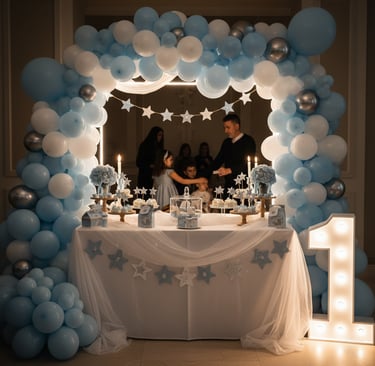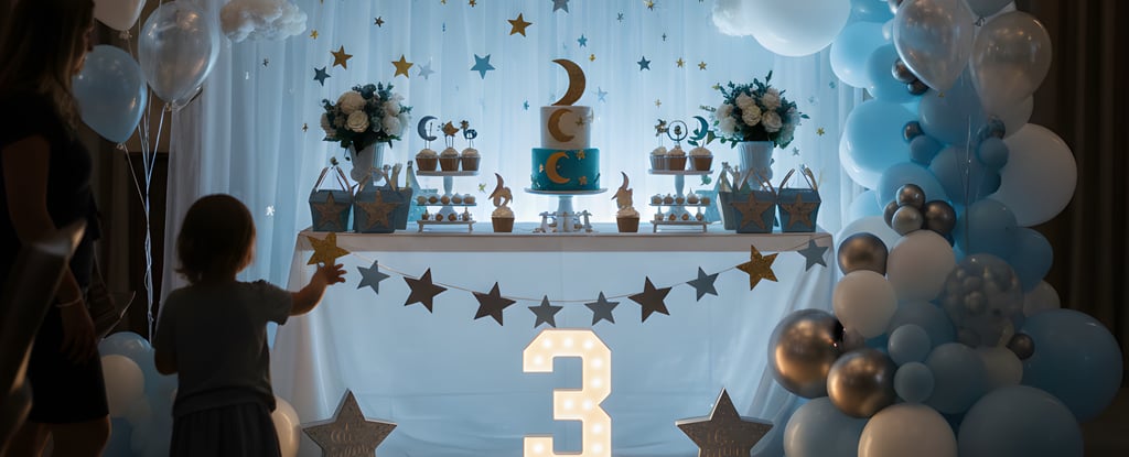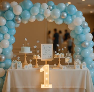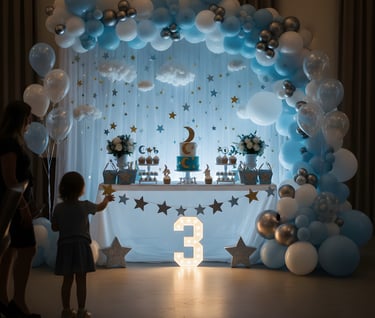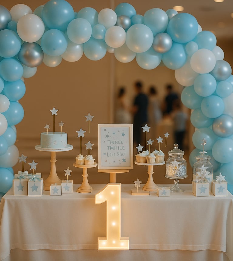 ¿Sueñas con una fiesta de cumpleaños que transporte a tu pequeño a un universo mágico? Imagina un cielo estrellado en tonos azul bebé, números luminosos que brillan con alegría y una atmósfera que celebra la ilusión.