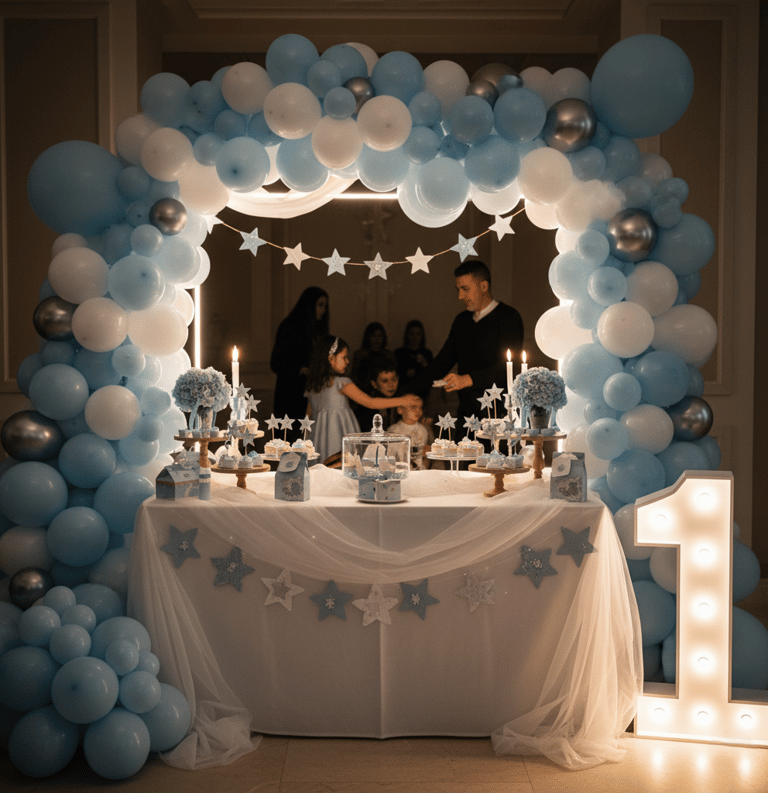 Comienza por definir el espacio principal: ¿dónde colocarás la mesa de dulces y la zona de fotos? Un telón de fondo (backdrop) azul bebé con estrellas plateadas o doradas será el punto focal. Luego, añade globos en diferentes tonos de azul, blanco y plateado, creando una guirnalda orgánica que enmarque la mesa. Los números luminosos, colocados sobre la mesa o en el suelo, indicarán la edad del cumpleañero. Finalmente, distribuye elementos decorativos como nubes de algodón, guirnaldas de estrellas y confeti brillante.